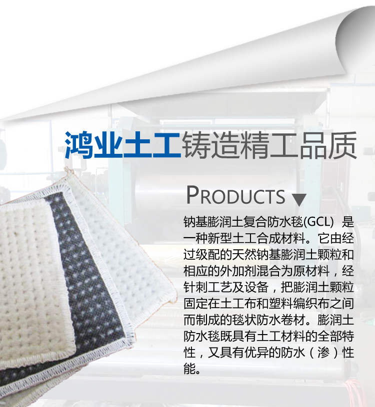 鈉基膨潤土復(fù)合防水毯(GCL) 是一種新型土工合成材料。它由經(jīng)過級配的天然鈉基膨潤土顆粒和相應(yīng)的外加劑混合為原材料,經(jīng)針刺工藝及設(shè)備,把膨潤土顆粒固定在土工布和塑料編織布之間而制成的毯狀防水卷材。膨潤土防水毯既具有土工材料的全部特性,又具有優(yōu)異的防水(滲)性能。