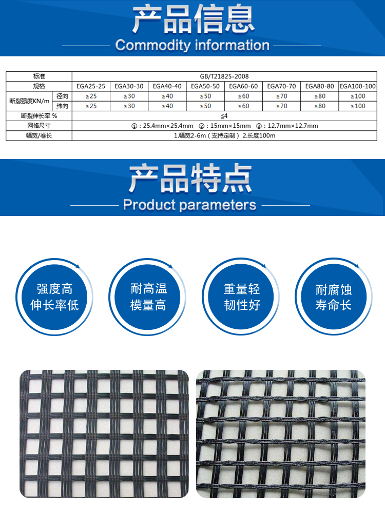 產(chǎn)品有強度高、伸長率低、耐高溫、模量高、重量輕、韌性好、耐腐蝕、壽命長等特點,可廣泛應(yīng)用于舊的水泥路面、機場跑道的維修、堤壩、河岸、邊坡防護、道橋路面增強處理等工程領(lǐng)域,可給路面增強、補強,防止路面車轍疲勞裂紋,熱冷伸縮裂紋和下面的反射裂紋,并能將路面承載應(yīng)力分散,延長路面使用壽命,高抗拉強度低延伸率,無長期蠕變,物理化學(xué)穩(wěn)定性好,熱穩(wěn)定性好,抗疲勞開裂,耐高溫車轍,抗低溫縮裂,延緩減少反射裂縫。